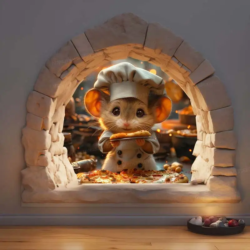 Chef Mouse Wall Decal - Adorable Mouse Hole Sticker with Cute Chef Mouse Making Pizza in Kitchen-Quirky Kitchen Decor M1082